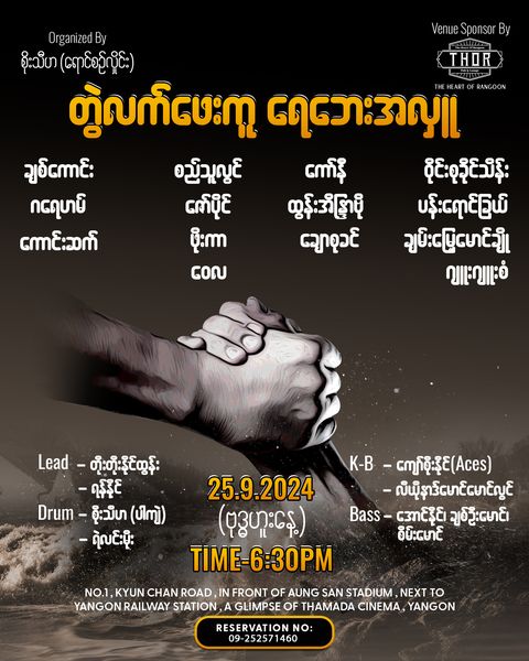 နာမည်ကြီးအဆိုတော်ကြီးတွေ ပါဝင်ဖျော်ဖြေကြမယ့် “တွဲလက်ဖေးကူ ရေဘေးအလှူ” Charity Concert ဖျော်ဖြေပွဲကိုတော့ စက်တင်ဘာ ၂၅ ရက် ညနေ ၆ နာရီခွဲမှာ ရန်ကုန်မြို့၊ ရန်ကုန်ဘူတာကြီးအနီးရှိ The Heart of Rangoon-THOR မှာ ကျင်းပမှာဖြစ်ပါတယ်။