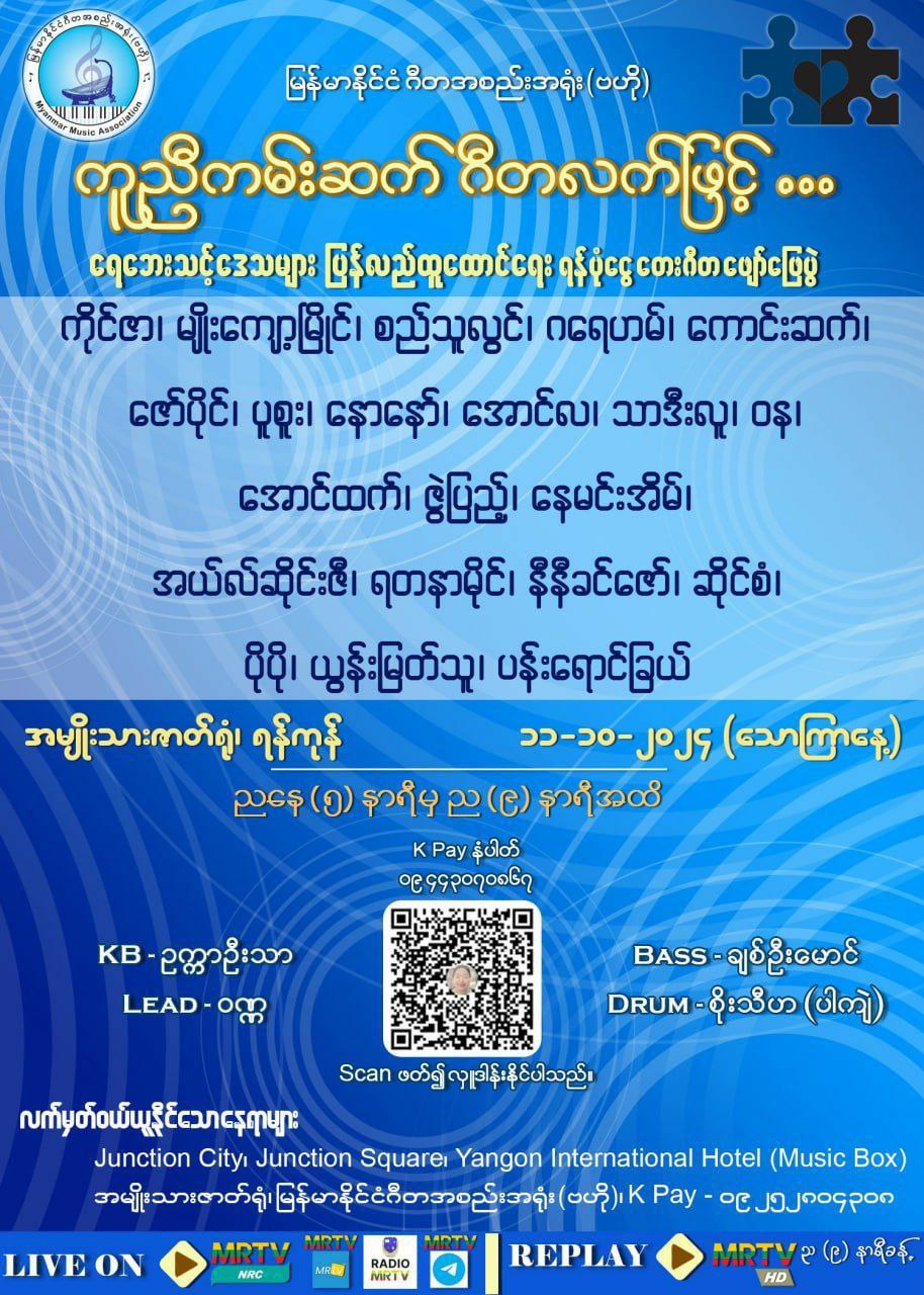 မြန်မာနိုင်ငံဂီတအစည်းအရုံး(ဗဟို)မှကြီးမှူး၍ ရေဘေးသင့်ဒေသများ၏ ပြန်လည်ထူထောင်ရေးလုပ်ငန်းများအတွက် “ကူညီကမ်းဆက် ဂီတလက်ဖြင့်”ခေါင်းစဥ်ဖြင့် ရန်ပုံငွေတေးဂီတဖျော်ဖြေပွဲအား လာမည့် အောက်တိုဘာ ၁၁ ရက်ည နေ ၅ နာရီမှ ည ၉ နာရီအထိ အမျိုးသားဇာတ်ရုံ (ရန်ကုန်)၌ကျင်းပသွားမည်ဖြစ်ကြောင်း သိရသည်။