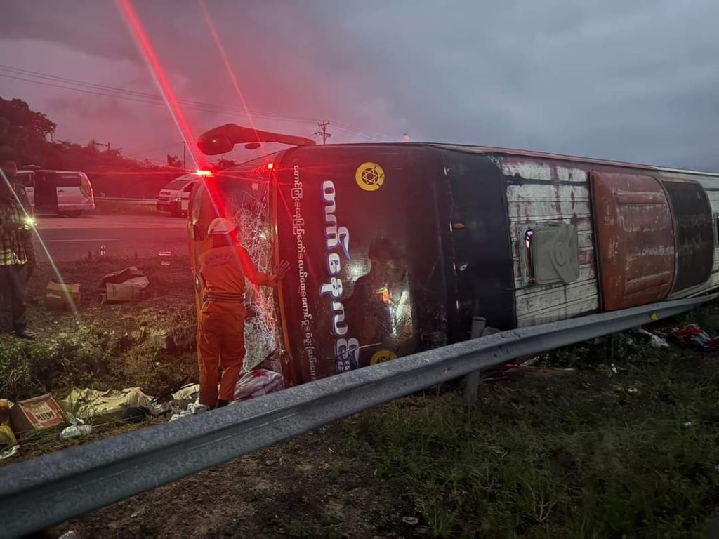 အမြန်လမ်းမှာ တက်နေလင်း ခရီးသည်တင်ယာဉ်တစ်စီး တိမ်းမှောက်လို့ နှစ်ဦးသေ၊ ဆယ်ဦး ဒဏ်ရာရ