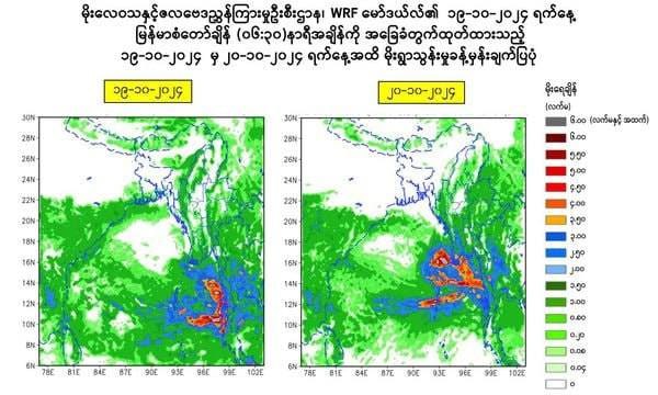 ကပ္ပလီပင်လယ်ပြင် မြောက်ပိုင်းတွင် ဖြစ်ပေါ်နေသော လေဖိအားနည်းဆဲလ်သည် အနောက်မြောက်ဘက်သို့ ရွေ့လျားနိုင်ပြီး၊ ပိုမိုအားကောင်းလာနိုင်ကာ ဘင်္ဂလားပင်လယ်အော်အရှေ့အလယ်ပိုင်းနှင့် ယင်းနှင့်ဆက်စပ်လျက်ရှိသော ကပ္ပလီပင်လယ်ပြင် မြောက်ပိုင်းတို့တွင် ၂၁-၁၀-၂၀၂၄ ရက်နေ့၌ လေဖိအားနည်းရပ်ဝန်း(Low Pressure Area)အဖြစ်သို့ လည်းကောင်း၊ ၂၃-၁၀-၂၀၂၄ ရက်နေ့တွင် မုန်တိုင်းငယ်(Depression) အဖြစ်သို့လည်းကောင်း ရောက်ရှိ နိုင်သည်ဟု မိုး/ဇလမှ ခန့်မှန်းထားပါသည်။