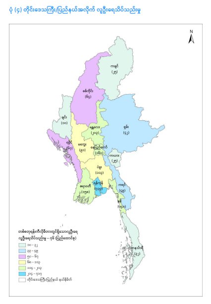 ၂၀၂၄ ခုနှစ် သန်းခေါင်စာရင်း၊ ရှေ့ပြေးလူဦးရေစာရင်းအရ ၂၀၂၄ ခုနှစ်၊ စက်တင်ဘာလ(၃၀)ရက်နေ့ ညသန်းခေါင်ယံ အချိန်(သန်းခေါင်စာရင်းရည်ညွှန်းချိန်)တွင် မြန်မာနိုင်ငံအတွင်း၌ ရှိနေသော လူဦးရေစုစုပေါင်းမှာ (၅၁၃၁၆၇၅၆)ဦး ဖြစ်ပြီး ကောက်ယူရရှိသော လူဦးရေမှာ (၃၂၁၉၁၄၀၇)ဦးဖြစ်သည်။ စာရင်းကောက်ယူနိုင်ခြင်းမရှိသည့် ဒေသများအတွက် Remote Sensing နည်းပညာဖြင့် ဆောင်ရွက်၍ ခန့်မှန်းတွက်ချက်ထားသော လူဦးရေစာရင်းမှာ (၁၉၁၂၅၃၄၉)ဦးဖြစ်သည်။ အဆိုပါကိန်းဂဏန်းများကို ပင်မအစီရင်ခံစာထုတ်ပြန်ပြီးစီးအချိန်အထိ ရှေ့ပြေးလူဦးရေကိန်းဂဏန်းများအဖြစ် အသုံးပြုသွားမည်ဟု သိရသည်။