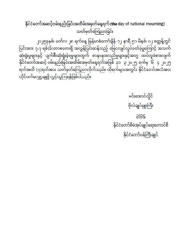 နစကဥက္ကဋ္ဌ နိုင်ငံတော်ဝန်ကြီးချုပ် ဗိုလ်ချုပ်မှူးကြီးမင်းအောင်လှိုင်လက်မှတ်ရေးထိုး၍ ယနေ့ မတ် ၃၁ ရက်မှစ၍ ဧပြီ ၆ ရက်အထိ (၇)ရက်တာအား နိုင်ငံတော်အဆင့်ဝမ်းနည်းခြင်းအထိမ်းအမှတ်နေ့ရက်အဖြစ်သတ်မှတ်ခဲ့ကြောင်း သိရသည်။