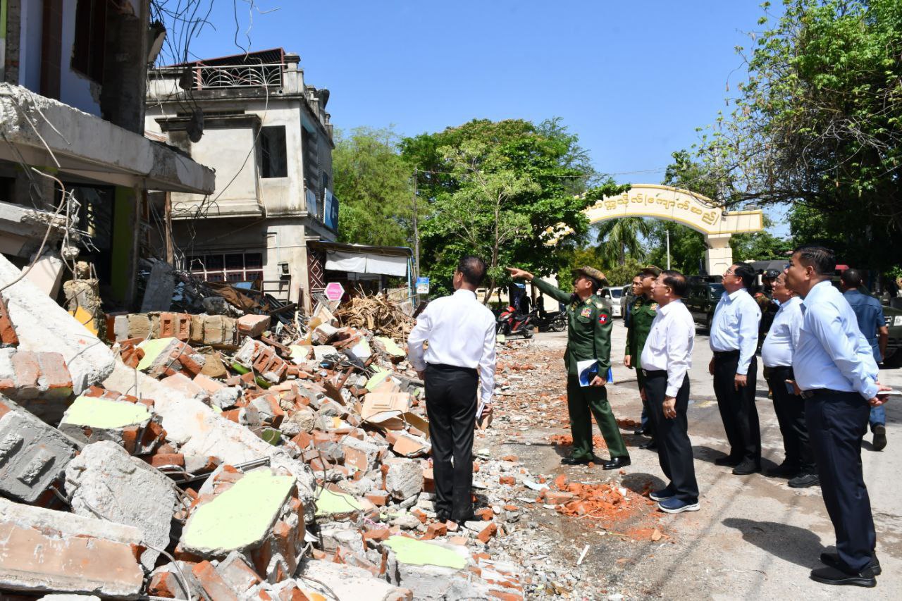 မန္တလေးငလျင်ကြီးဒဏ်ကြောင့် ပျက်စီးဆုံးရှုံးမှုများဖြစ်ပေါ်ခဲ့သည့် မန္တလေးတိုင်း၊ ကျောက်ဆည်မြို့၌ ပြန်လည်ထူထောင်ရေးလုပ်ငန်းများဆောင်ရွက်နေမှုများကို နစက ဥက္ကဋ္ဌ၊ နိုင်ငံတော်ဝန်ကြီးချုပ်၊ ဗိုလ်ချုပ်မှူးကြီးမင်းအောင်လှိုင်မှ ဧပြီ ၁၅ ရက် နံနက်ပိုင်းက သွားရောက် ကြည့်ရှုစစ်ဆေးခဲ့သည်။