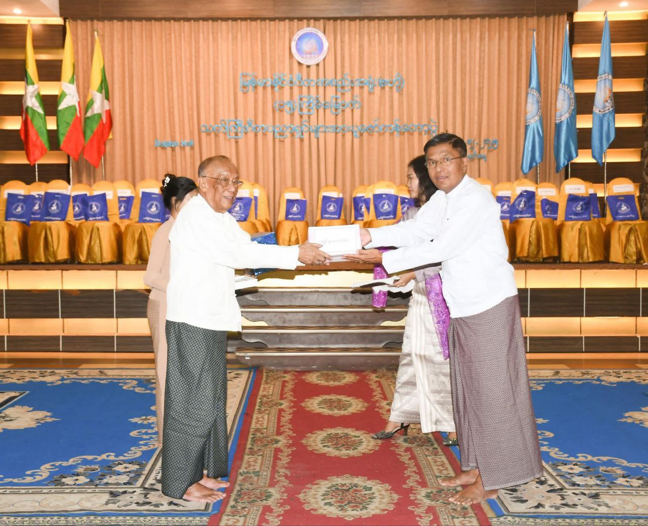 အဆိုပါ ငွေကျပ်(၁၄၅)သိန်းကျော်တန်ဖိုးရှိ အင်္ကျီ၊ ပုဆိုး၊ လက်ဆွဲအိတ်၊ ခြုံပုဝါနှင့် ပါတိတ်လုံချည်တို့ကို နိုင်ငံတော် ယာယီသမ္မတနှင့် ဇနီးတို့ကိုယ်စား ပြန်ကြားရေးဝန်ကြီးဌာန ပြည်ထောင်စုဝန်ကြီး ဦးမောင်မောင်အုန်းက ပေးအပ်လှူဒါန်းခဲ့ခြင်းဖြစ်ကြောင်း သိရသည်။