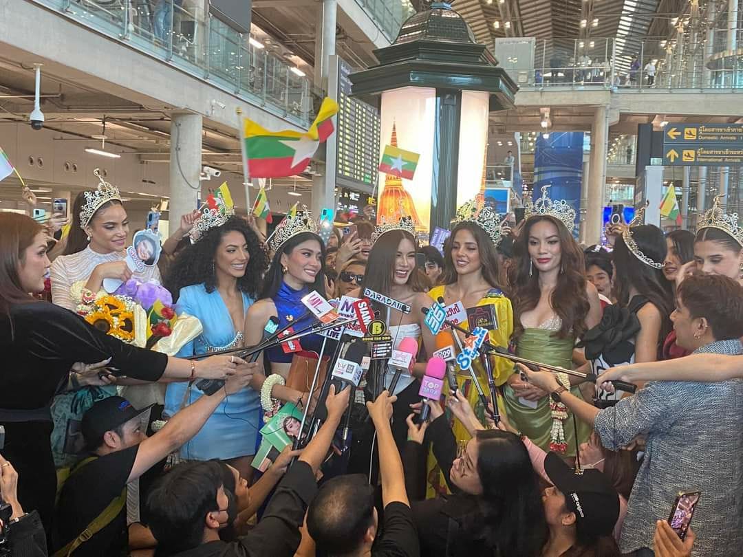 ဗီယက်နမ်နိုင်ငံကနေ ထိုင်းနိုင်ငံ ဘန်‌ကောက်မြို့ Suvarnabhumi International Airport ကို Miss Grand International 2023 ပြိုင်ပွဲက Top 10 စာရင်းဝင် အလှမယ်တွေ အားလုံး လာရောက်ခဲ့ကြတာလည်းဖြစ်ပြီး ထိုင်းနိုင်ငံက မီဒီယာတွေလည်း လာရောက်ခဲ့ကြတာ တွေ့ရပါတယ်။