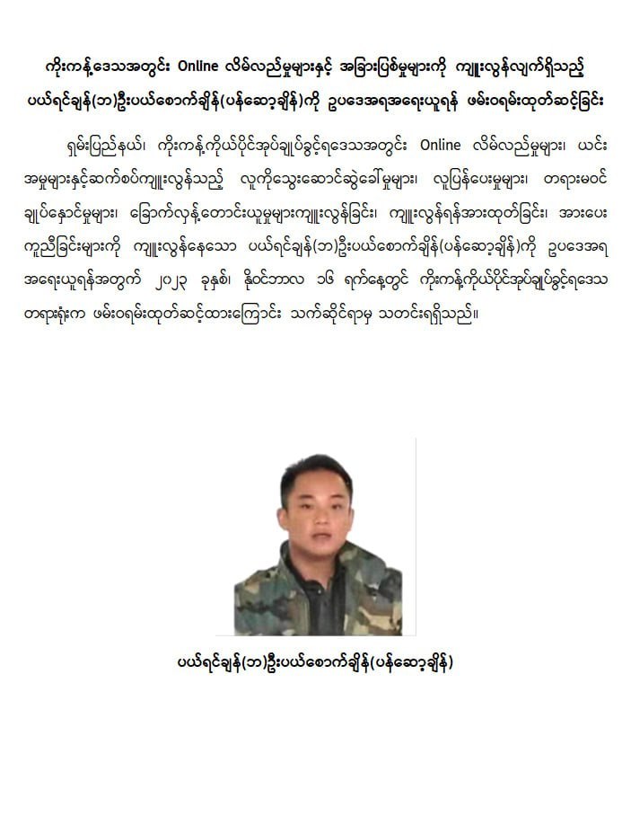 ရှမ်းပြည်နယ်၊ ကိုးကန့်ကိုယ်ပိုင်အုပ်ချုပ်ခွင့်ရဒေသအတွင်း online လိမ်လည်မှုများ၊ ယင်းအမှုများနှင့်ဆက်စပ်ကျူးလွန်သည့် လူကိုသွေးဆောင်ဆွဲခေါ်မှုများ၊ လူပြန်ပေးမှုများ၊ တရားမဝင်ချုပ်နှောင်မှုများ၊ ခြောက်လှန့်တောင်းယူမှုများကျူးလွန်ခြင်း၊ ကျူးလွန်ရန်အားထုတ်ခြင်း၊ အားပေးကူညီခြင်းများကို ကျူးလွန်နေသော ပယ်ရင်ချန်(ဘ)ဦးပယ်စောက်ချိန်(ပန်ဆော့ချိန်)ကို ဉပဒေအရအရေးယူရန်အတွက် ၂၀၂၃ ခုနှစ်၊ နိုဝင်ဘာလ ၁၆ ရက်နေ့တွင် ကိုးကန့်ကိုယ်ပိုင်အုပ်ချုပ်ခွင့်ရဒေသတရားရုံးက ဖမ်းဝရမ်းထုတ်ဆင့်ထားကြောင်း သက်ဆိုင်ရာမှ သတင်းရရှိပါသည်။