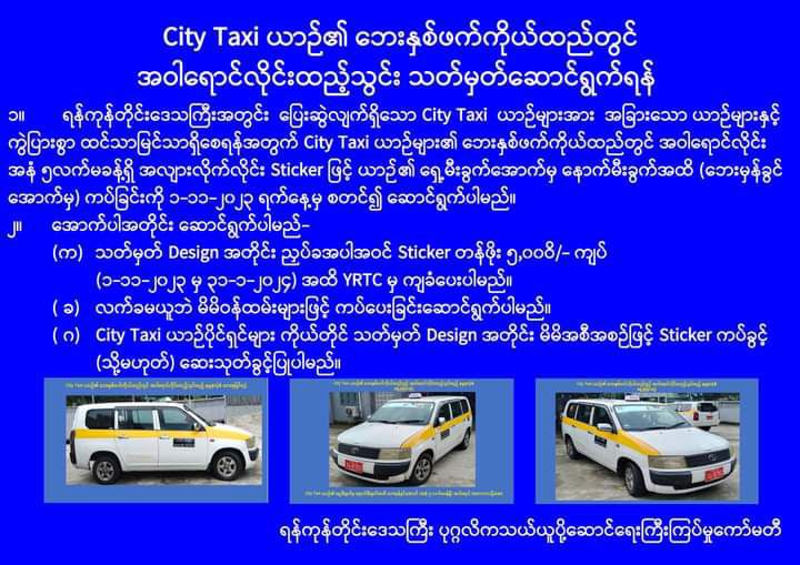 City Taxi ယာဉ်များအားလုံး စတစ်ကာတပ်ဆင်ရန် ညွှန်ကြားထားမှုသည် အခြားသောယာဉ်များနှင့် ကွဲပြားမှုရှိစေရန်၊ ထင်ထင်ရှားရှားမြင်နိုင်စေရန်၊ လုံခြုံမှုရှိစေရန်၊ ယာဉ်အန္တရာယ်၊ လမ်းအန္တရာယ် ကင်းရှင်းစေရန်ဖြစ်သည်။ အဆိုပါစီမံချက်ကို ပြီးခဲ့သည့် ၂၀၂၃ ခုနှစ် စက်တင်ဘာ ၂၈ ရက်တွင် ဆုံးဖြတ်ခဲ့ပြီး ၂၀၂၃ ခုနှစ် နိုဝင်ဘာ ၁ ရက်မှ ယခုနှစ် ဇန်နဝါရီ ၃၁ ရက်အထိ ပညာပေးကာလနှင့် ထိုကာလကျော်လွန်သည့် ဖေဖော်ဝါရီ ၁ ရက်မှ စတင်၍ စစ်ဆေးအရေးယူခြင်းများ ပြုလုပ်သွားမည်ဟု ရန်ကုန်တိုင်းဒေသကြီးပုဂ္ဂလိက သယ်ယူပိုဆောင်ရေး ကြီးကြပ်မှု ကော်မတီ (YRTC)မှ သတင်းရရှိသည်။