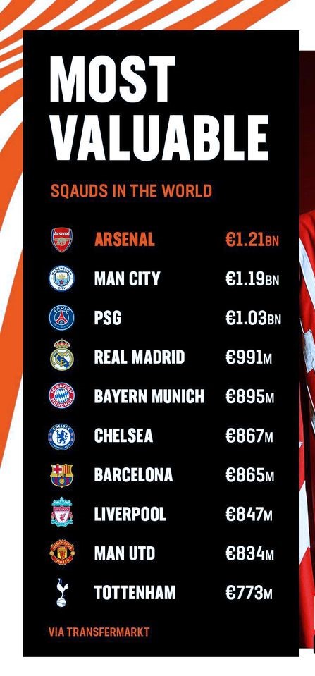 ထိပ်ဆုံးတွင် အာဆင်နယ်အသင်း က ယူရို (၁.၂၁)ဘီလီယံဖြင့် ဦးဆောင်နေပါတယ်။အာဆင်နယ်ဟာ (၂၀၂၃-၂၄)နွေရာသီအပြောင်းအရွေ့တွင် အရည်သွေးမြင့်လူငယ်ကစားသမား(၃)ဦး ခေါ်ယူခဲ့ပြီးနောက် ထိပ်ဆုံးနေရာကို တက်ရောက်လာနိုင်ခဲ့ခြင်းဖြစ်ပါတယ်။ ဒုတိယနေရာတွင် မန်ချက်စတာစီးတီးအသင်း က (၁.၁၉)ဘီလီယံ၊တတိယနေရာတွင် ပဲရစ်စိန့်ဂျာမိန်းစ်အသင်းက (၁.၀၃)ဘီလီယံ၊ စတုတ္ထနေရာတွင် ရီးရဲလ်မက်ဒရစ်အသင်းက (၉၉၁)သန်း၊ပဉ္စမနေရာတွင် ဘိုင်ယန်မြူးနစ်အသင်းက (၈၉၅)သန်း၊ဆဌမနေရာတွင် ချယ်လ်ဆီးအသင်းက (၈၆၇)သန်း၊သတ္တမနေရာတွင် ဘာစီလိုနာအသင်းက (၈၆၅)သန်း၊အဋ္ဌမနေရာတွင် လီဗာပူးလ်အသင်းက (၈၄၇)သန်း၊နဝမနေရာတွင် မန်ချက်စတာယူနိုက်တက်အသင်းက (၈၃၄)သန်း၊ဒသမနေရာတွင် တော့တင်ဟမ်ဟော့စပါးအသင်းက (၇၇၃)သန်းဖြင့် အစဉ်လိုက်ရပ်တည်နေပါတယ်။