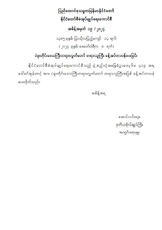 အဆိုပါ တိုင်းဒေသကြီးတရားလွှတ်တော် တရားသူကြီး ခန့် အပ်မှုကို နစက အနေဖြင့် ဖွဲ့စည်းပုံအခြေခံဥပဒေ ပုဒ်မ ၄၁၉ အရ လုပ်ဆောင်ခြင်း ဖြစ်ကြောင်း ကောင်စီ အတွင်းရေးမှူး ဒုတိယဗိုလ်ချုပ်ကြီး အောင်လင်းဒွေးက အမိန့်ထုတ်ပြန်ခဲ့ခြင်း ဖြစ်သည်။