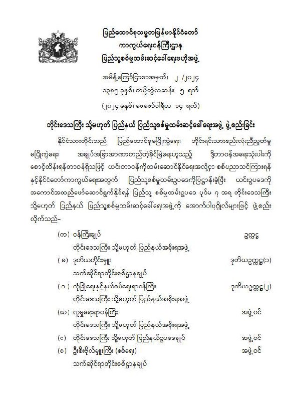 တိုင်းဒေသကြီး သို့မဟုတ် ပြည်နယ် ပြည်သူ့ စစ်မှုထမ်းဆင့်ခေါ်ရေးအဖွဲ့ ဖွဲ့စည်းခြင်းကို ကာကွယ်ရေး၀န်ကြီးဌာနက ဖေဖော်ဝါရီလ ၁၄ ရက်နေ့ရက်စွဲနဲ့ ထုတ်ပြန်လိုက်ပါတယ်။