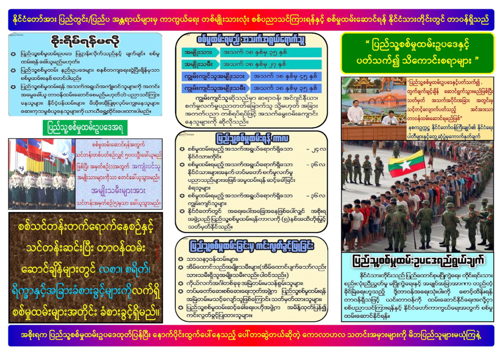 လက်ရှိတွင် ပြည်သူ့စစ်မှုထမ်းနည်းဥပဒေ (မူကြမ်း)ကို ရေးဆွဲထားရှိပြီး သက်ဆိုင်ရာပညာရှင်များမှ နောက်ဆုံးအတည်ပြုနိုင်ရေး အဘက်ဘက်မှ စိစစ်သုံးသပ်လျက်ရှိကြောင်း၊ အဆိုပါ နည်းဥပဒေတွင် ပါဝင်သော ကြိုတင်ဆောင်ရွက်၍ရသည့် လုပ်ငန်းစဉ်များအား သက်ဆိုင်ရာ တိုင်းဒေသကြီး/ ပြည်နယ် ပြည်သူ့စစ်မှုထမ်းခေါ်ဆောင်ရေး အဖွဲများကို အကြောင်းကြားထားပြီး ၎င်းမှတစ်ဆင့် သက်ဆိုင်ရာ ရပ်ကွက်၊ ကျေးရွာအလိုက် အကျုံးဝင်သည့် စာရင်းများ ကောက်ယူခြင်း ဆောင်ရွက်စေလျက်ရှိကြောင်း နစက သတင်းထုတ်ပြန်ရေးအဖွဲက ဆိုပါတယ်။