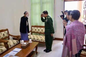 နိုင်ငံတော်စီမံအုပ်ချုပ်ရေးကောင်စီဥက္ကဋ္ဌ တပ်မတော်ကာကွယ်ရေး ဦးစီးချုပ် ဗိုလ်ချုပ်မှူးကြီး မင်းအောင်လှိုင်နှင့် ဇနီး ဒေါ်ကြူကြူလှ တို့သည် (၇၉) နှစ်မြောက် တပ်မတော်နေ့အထိမ်းအမှတ် အကြိုဂုဏ်ပြုညစာစားပွဲသို့ တက်ရောက် လာကြသည့် အထူးဖိတ်ကြားထားသည့် ဧည့်သည်တော်များအား ရင်းရင်းနှီးနှီး နှုတ်ဆက်ကြသည်။