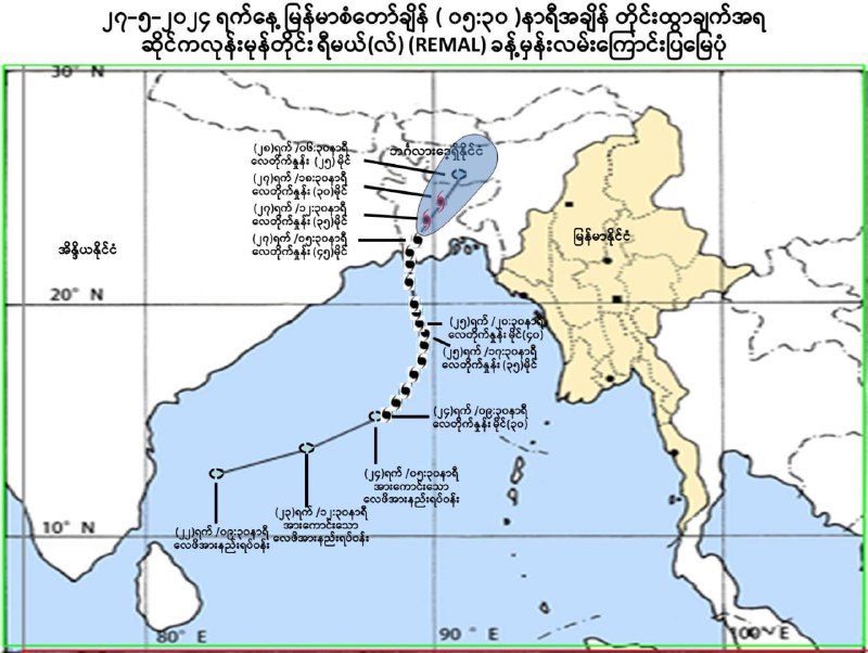 မုန်တိုင်း အရှိန်ကြောင့် ရန်ကုန်အပါအဝင် တိုင်းနဲ့ပြည်နယ်အဝှမ်း မိုးကြီးမယ်လို့ မိုး/ဇလက ထုတ်ပြန်လိုက်ပါတယ်။ ဆိုင်ကလုန်းမုန်တိုင်း “ရီမယ်(လ်)” (REMAL)သည် ဘင်္ဂလားဒေ့ရှ်နိုင်ငံနှင့် ယင်းနှင့် ဆက်စပ်လျက်ရှိသော အိန္ဒိယနိုင်ငံ၊ အနောက်ဘင်္ဂလားပြည်နယ် ကမ်းခြေဒေသများကို ဖြတ်ကျော်ပြီး လာမည့် ၁၅ နာရီအတွင်း တစ်ဖြည်းဖြည်း အားလျော့သွား နိုင်တယ်လို့လည်းဆိုပါတယ်။