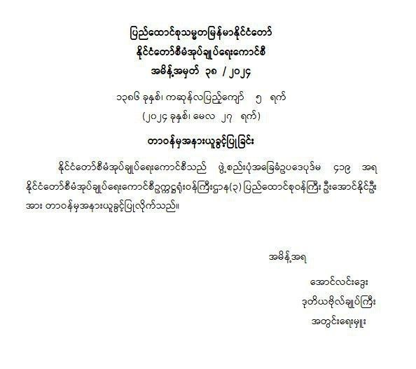 ထို့ပြင် နိုင်ငံတော်စီမံအုပ်ချုပ်ရေးကောင်စီသည် ဖွဲ့စည်းပုံအခြေခံဥပဒေပုဒ်မ ၄၁၉ အရ စီမံကိန်းနှင့် ဘဏ္ဍာရေးဝန်ကြီးဌာန ဒုတိယ ဝန်ကြီးဦးမောင်မောင်ဝင်းအား တာဝန်မှအနားယူခွင့်ပြုလိုက်ကြောင်း နိုင်ငံတော်စီမံအုပ်ချုပ်ရေးကောင်စီ အမိန့် အမှတ်(၃၉/၂၀၂၄) ဖြင့် ထုတ်ပြန်လိုက်သည်။