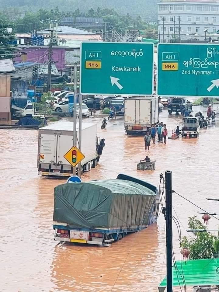 ကရင်ပြည်နယ်၊ မြဝတီမြို့တွင် မိုးသည်းထန်စွာ ရွာသွန်းသဖြင့် တစ်မြို့လုံးနီးပါး ရေကြီးနေတယ်လို့သိရပါတယ်။ ဇွန်လ ၈ ရက်နေ့ ညသန်းခေါင်ယံချိန်မှစတင်ပြီး ယနေ့ နံနက်ပိုင်းအထိ မိုးများ သည်းထန်စွာ ရွာသွန်းခဲ့သဖြင့် မြ၀တီမြို့နေရာ အများစု တွင် ရေကြီးနေပြီး လတ်တလော ရေဘေးကြောင်း ပြောင်းရွှေ့ရသူမရှိသော်လည်း သွားလာရေးအခက်အခဲ ဖြစ်နေတယ်လို့ သိရပါတယ်။