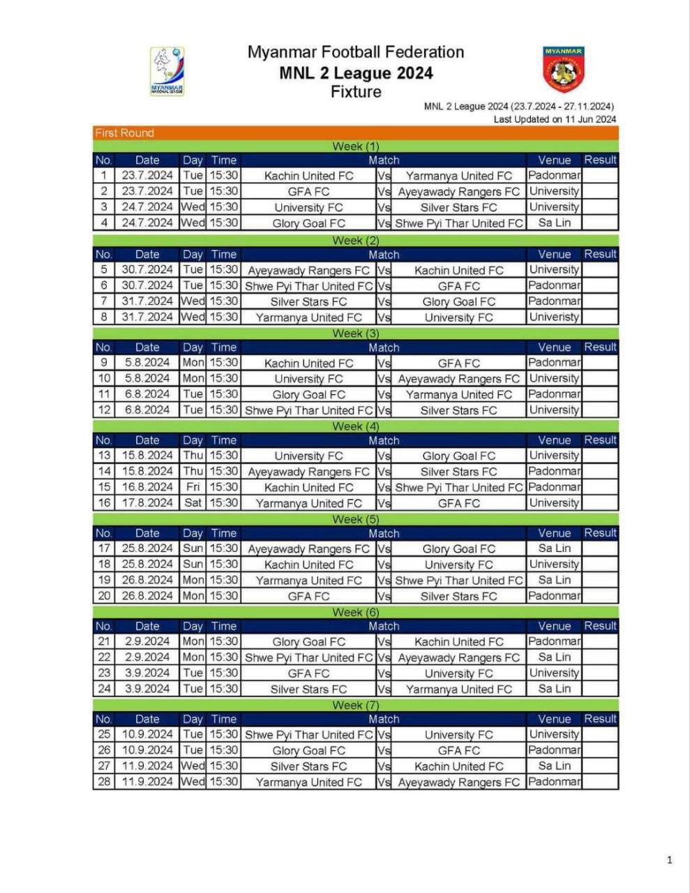 ပြိုင်ပွဲဝင်အသင်း (၈)သင်း ပါဝင်မည့် ၂၀၂၄ မြန်မာနေရှင်နယ်လိဂ်-၂ ပြိုင်ပွဲအတွက် ပွဲစဉ်ဇယားထုတ်ပြန်