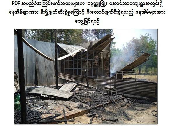 ထို့ပြင် PDF အမည်ခံအကြမ်းဖက်သမားများက ကျေးရွာအတွင်းရှိ နေအိမ်များအား မီးရှို့ဖျက်ဆီးခဲ့မှုကြောင့် နေအိမ် ၃၆ လုံး မီးလောင်ပျက်စီးခဲ့ရကြောင်းသိရှိရပြီး ဖြစ်စဉ်တွင် ထိခိုက်ဒဏ်ရာရရှိခဲ့သည့် ဆရာမ ၁ ဦးအား လုံခြုံရေးတပ်ဖွဲ့ဝင်များက ပခုက္ကူမြို့ ပြည်သူ့ဆေးရုံသို့ ပို့ဆောင်ဆေးကုသမှုခံယူစေလျက်ရှိကြောင်း သိရ သည်။