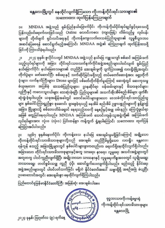 MNDAA အကြမ်းဖက်လုပ်ရပ်များကို ပြင်းထန်စွာ ကန့်ကွက်ရှုတ်ချကြောင်း မန္တလေးကိုးကန့်တိုင်းရင်းသား မိသားစုများ ထုတ်ပြန်